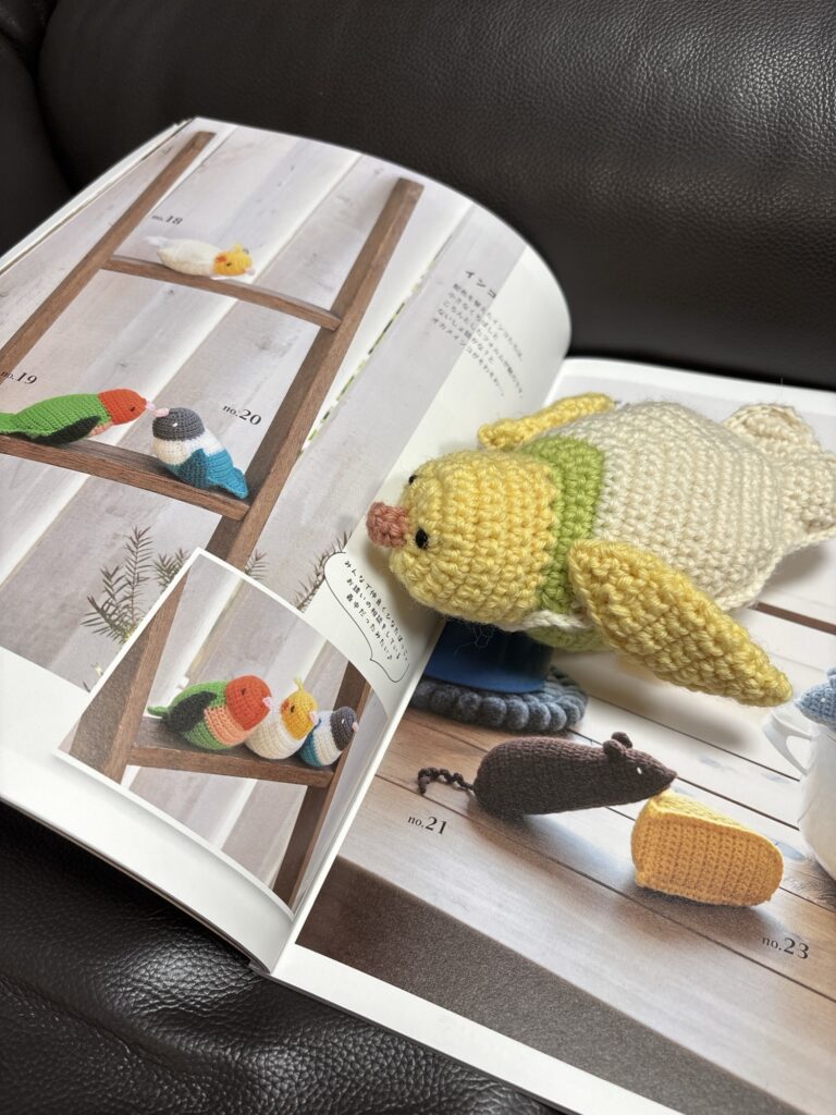 インコ🦜の編みぐるみ 未分類 2025.09.12 『平面パーツをはぎ合わせるぬいぐるみみたいな「あみぐるみ」』からインコを編んで、義母のインコのぴーちゃんにプレゼントしようと思ったけれど、、、編みぐるみはセンスないのかな、、、難しかった、、、