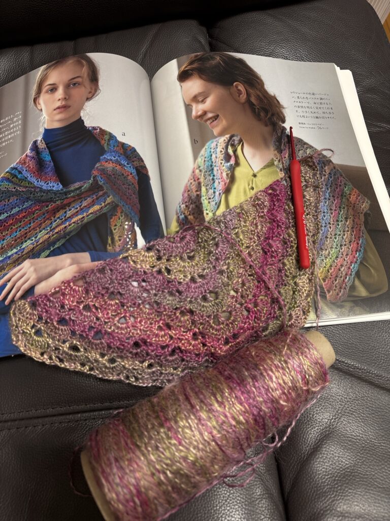 三角ショール 未分類 2025.07.08 ヨーロッパの手あみより、クロッシェ模様の三角ショール編んでいる。ITOBATAKEさんの糸 カメレオン 思い出を使っているけれど、とても美しい糸!柔らかく、ツヤがあって、ふんわり。編みながら癒される。。。