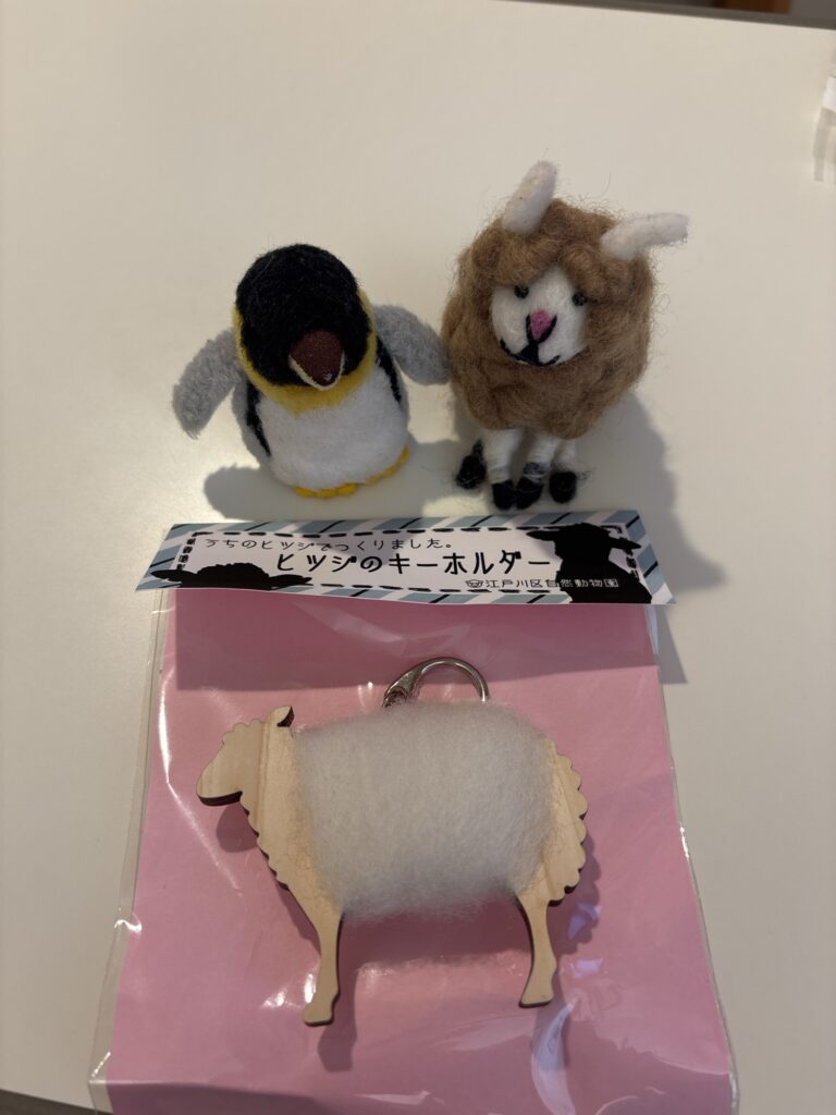 病院のそばの公園を初めて散歩しました。そこにいるひつじさんの毛のキーホルダーを買いました。ひつじさんに仲間ができたね!