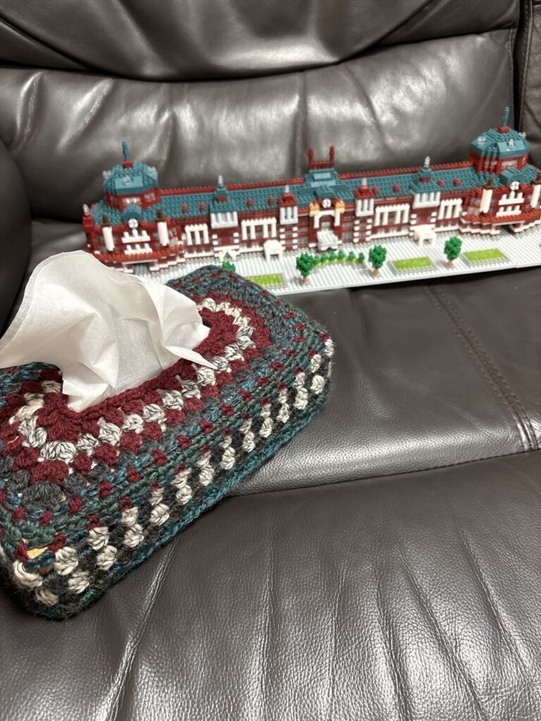 ほんのちょっと余った毛糸で、なんとなくティッシュカバーを編んでみたら、ナノブロックの東京駅とめちゃくちゃ同じテイストに!