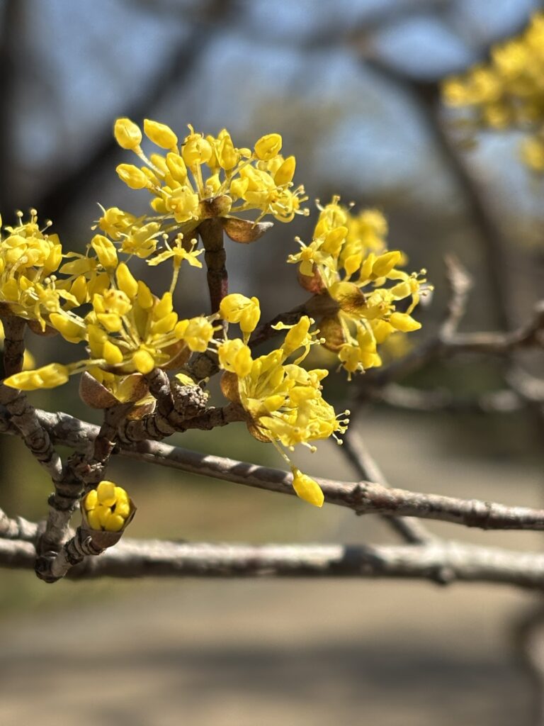日差しが明るくなってきて、春の花が咲いてきたので、散歩が楽しい季節です。昭和記念公園でみつけた黄色い小花はサンシュユの木に咲くかわいいお花。