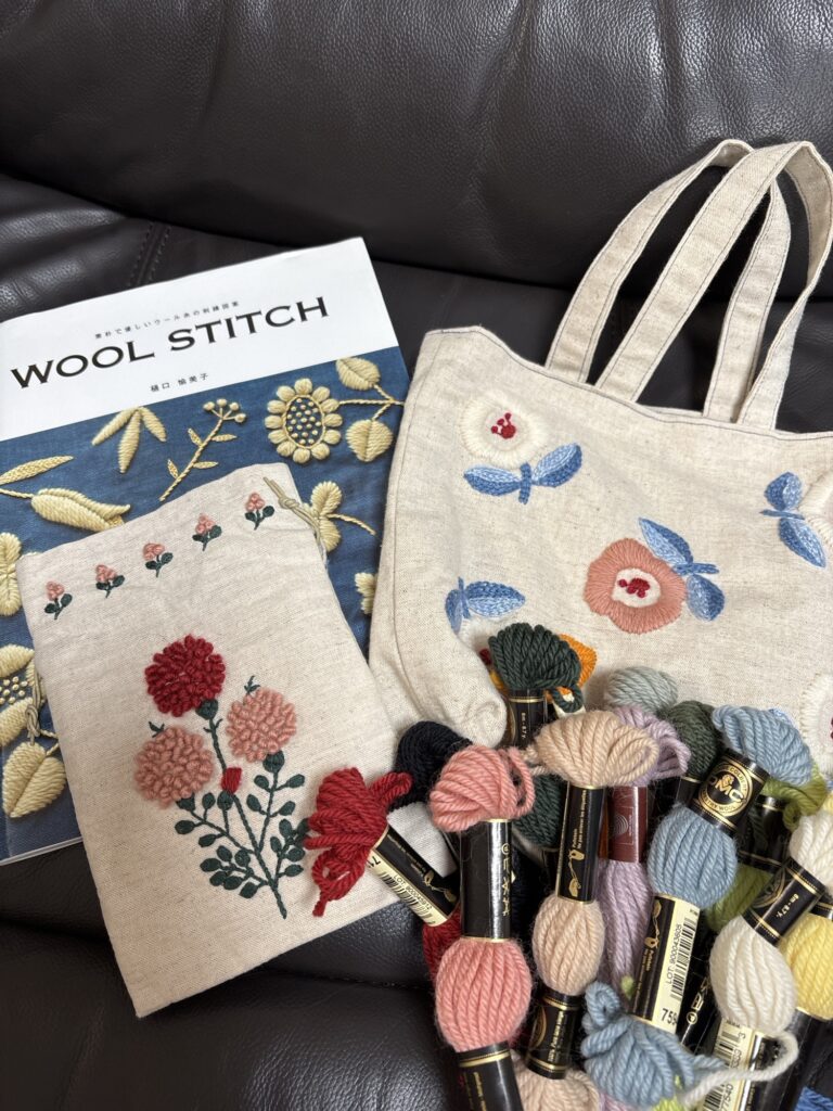 花が好きで、花柄や植物のモチーフが大好きです。樋口愉美子さんのウールステッチ、チャレンジしてみました!ウールの刺繍糸は越前屋さんで!