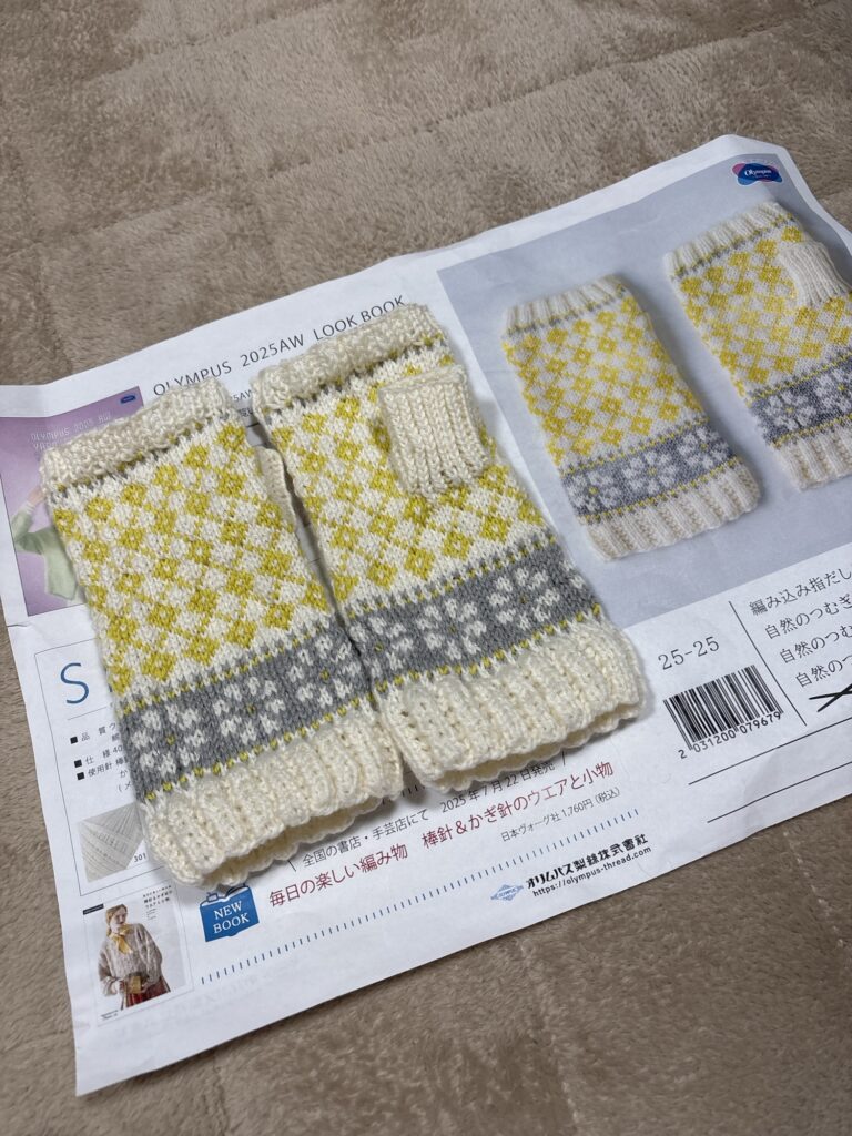 編み込み指だしミトン 未分類 2025.11.27 オリムパスの編み物キット『編み込み指だしミトン』楽しかった!編み込み初心者なので、ちょっと引きつれてる感ありだけど、花柄模様も色合いもステキで、うれしいな。